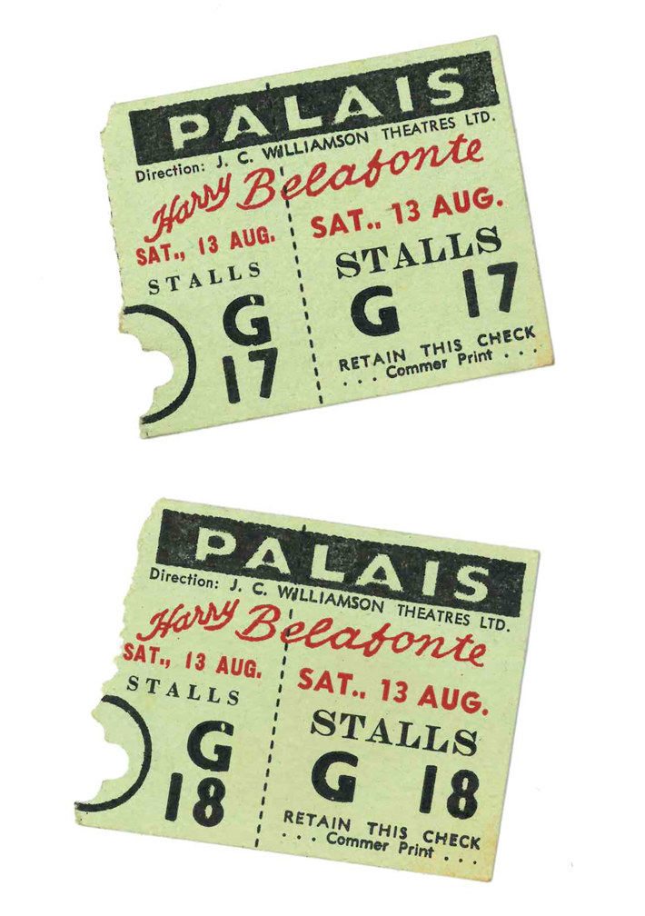 Ticket stubs for a Harry Belafonte concert at the Palais Theatre, 13th August, 1960 (Port Phillip Heritage Centre collection)