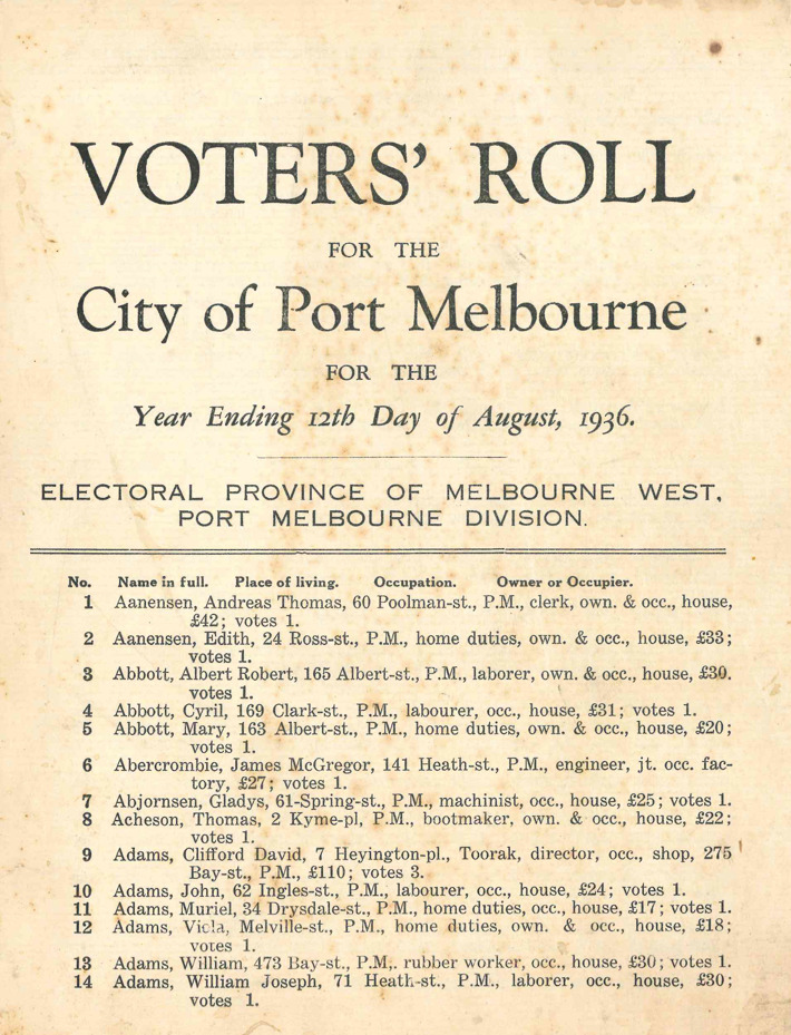 City of Port Melbourne Voter's Roll, 1936 (Port Phillip Heritage Centre collection)