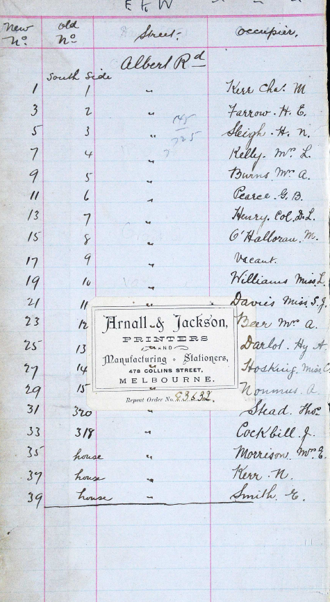 South Melbourne Number Change Book 1 - Streets Beginning A to P (Port Phillip Heritage Centre collection)